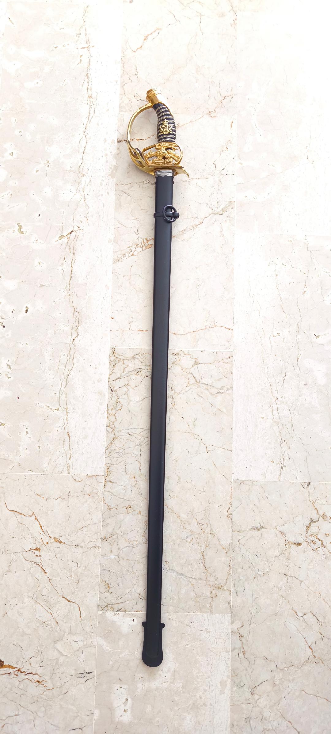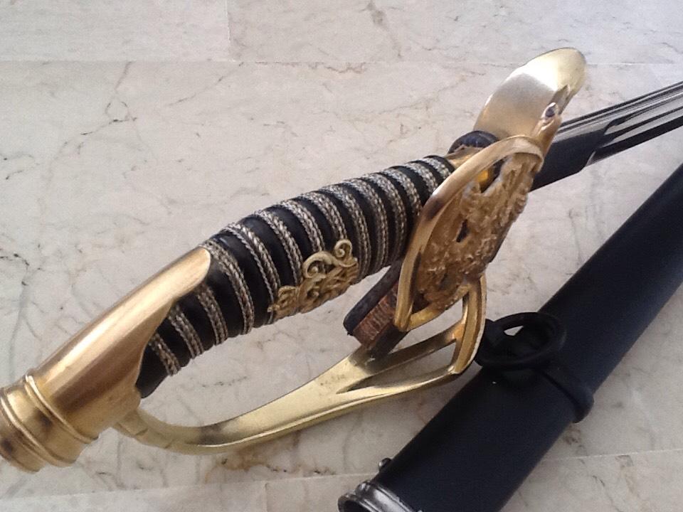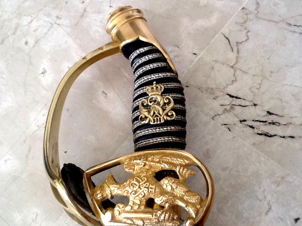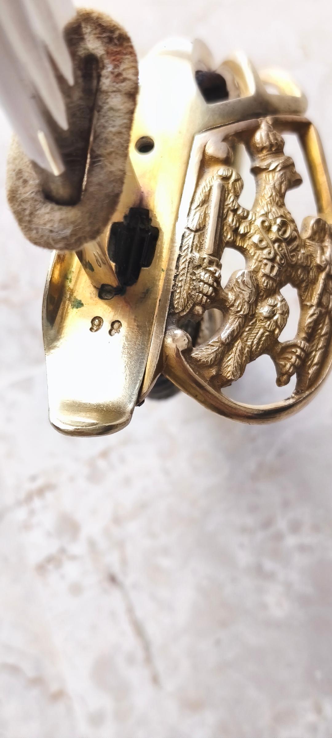 Рукоять из позолоченной латуни. Трехствольная гарда с прусским орлом. Короткохвостый навершие, и позолоченной латунной монограммой Вильгельма II клинок, длиной 80,6 см. Клинок подписан на рикассо (Coppel Alexander ALCOSO Solingen). Черные стальные ножны. На гарде изображен прусский орел, кайзер Вильгельм II. Период Второго рейха. Такие сабли с гардой, украшенной прусским орлом, очень трудно найти в первозданном виде; орнаменты часто оторваны или сломаны. Эта сабля также использовалась во время Первой мировой войны. Эта сабля, изготовленная в 1898 году, находится в очень хорошем состоянии. Рукоять сохранила позолоту. Клинок в очень хорошем состоянии. Ножны в хорошем состоянии; ножны были отреставрированы.